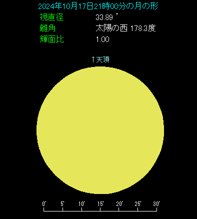 21時ごろに南東の方角を見上げると満月が見えます。満月となる時間は10月17日20時26分です。また、月が地球に最も接近するのは9時51分です。二つの時間は10時間35分もずれていますので、満月のタイミングが地球に最も近い位置にあるわけではありません。