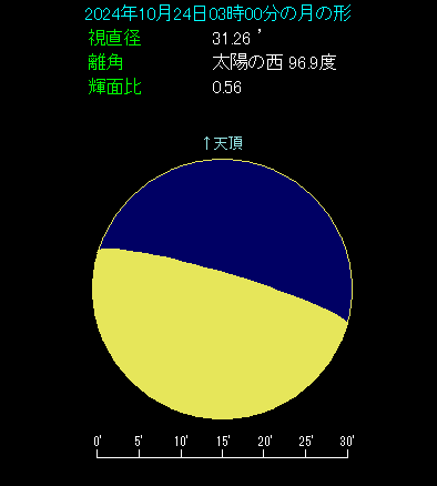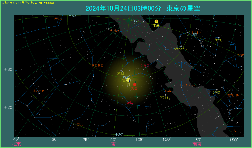 10月24日の未明、月と火星が斜めに並びます。 朝の3時ごろ、東の空を大きく見上げてください。今日が下弦という半月が見えます。月の右下を見ると赤い星が見つかり、火星です。間隔は3.9度ですからまずまずです。