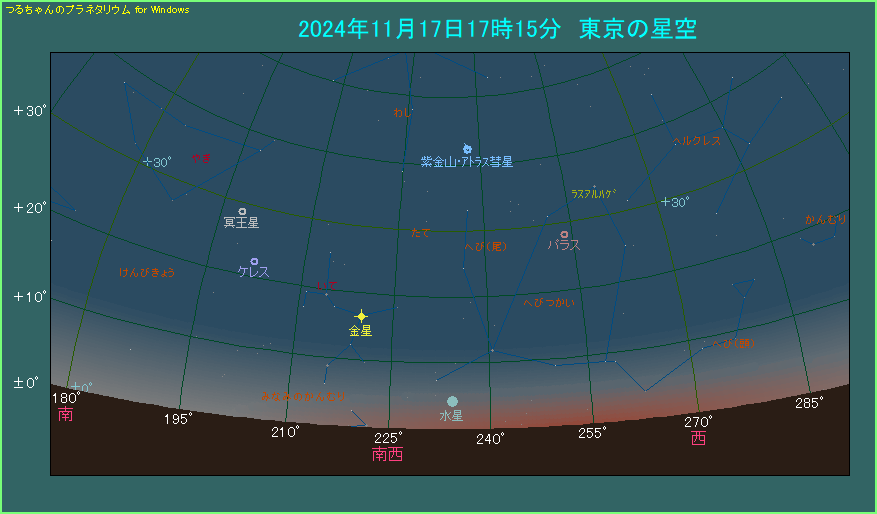 上の星図は東京で17時15分、日の入りから42分が経過した南西の空のようすです。水星の高度は4.1度しかありません。それにもかかわらず、空が完全に暗くなるのは46分後です。水星が-0.2等の明るさとはいえ、まだ空が明るいですからだいぶ見づらいでしょう。