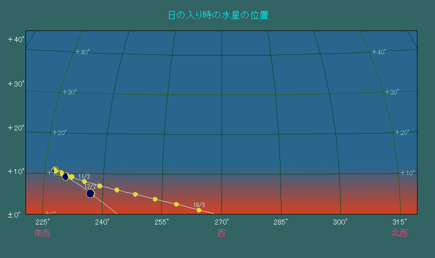日の入り時刻における水星の位置変化 |