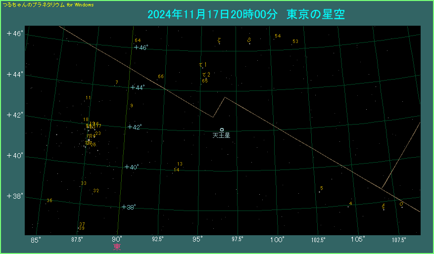 天王星は衝の頃でも5.7等と、肉眼で見えるかどうかといった明るさです。基本的には双眼鏡が必要と思ってください。20時ごろに東京からだと、天王星はほぼ真東に見えます。星座でいうとおうし座ですが、おひつじ座との境界に近い所です。20時ごろでしたら、おうし座すばるから右方向へたどるのが、わかりやすいでしょう。星数の多い領域ですので、他の星と間違えないようにしてください。