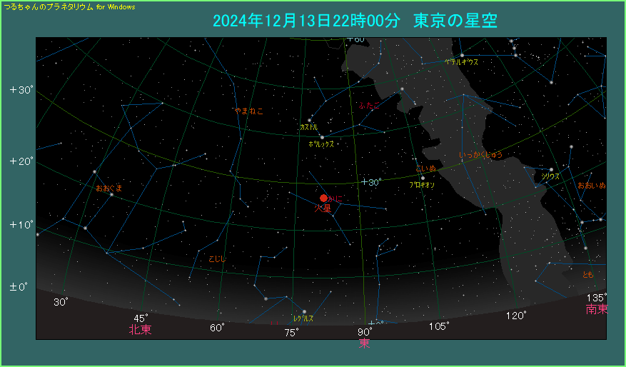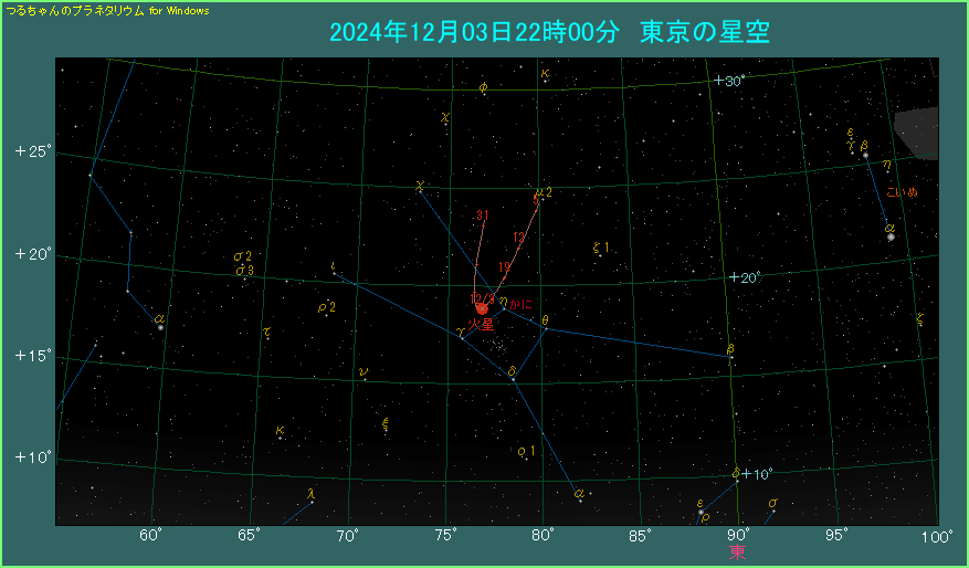 火星は12月8日に留となって、動きが極端に緩やかになります。そんなこともあって前後1週間くらいは、火星とプレセペ星団の位置関係がほとんど変わりません。この機会に両天体の接近の様子をゆっくりご覧になってください。