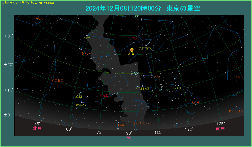 20時ごろ、東の空の中ほどに木星があります。木星は金色で周りのどの星よりも明るく輝きますから、都心からでも十分肉眼で見つけることができます。