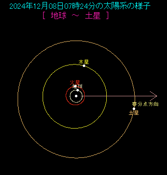 太陽系の図をご覧ください。太陽・地球・木星がこの順で一直線に並んでいます。衝の定義は惑星が太陽から180度離れることですから、まさにその通りの配列です。衝になった木星は地球に近づいており、しかも一晩中観測することができます。衝の頃は観測好機ですから、できれば望遠鏡を使って観測してください。