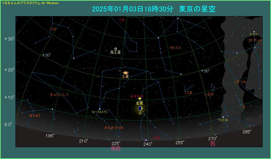 明けましておめでとうございます。 2025年は月と金星が縦に並ぶ接近の天文現象でスタートです。 18時半ごろ南西の低い位置をご覧ください。月齢3.5の三日月が見えます。月は右下側が光っています。一方の金星は月の上方にあり、-4.4等と非常に明るく輝きます。月と金星の間隔は4.9度と、狭いわけではありません。