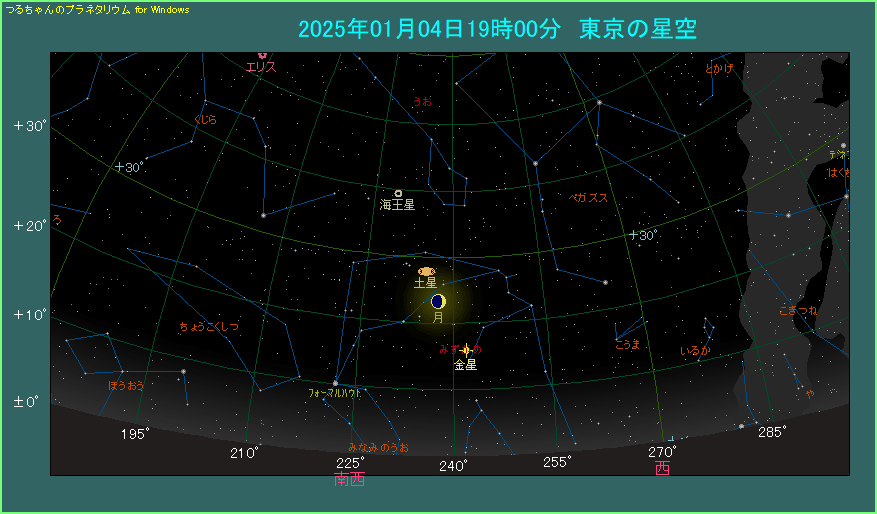1月4日の夕方は、月と土星が斜めに並びます。