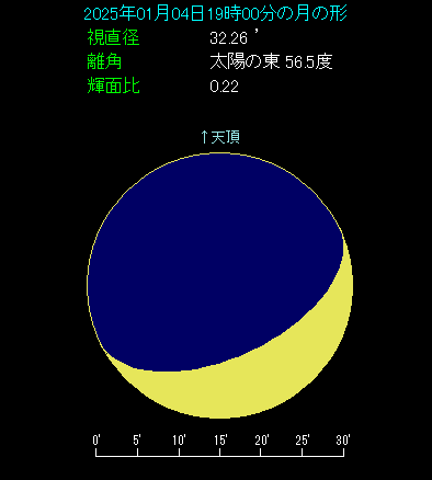 昨日に続いて、19時ごろに南西の方角をご覧ください。月齢4.5の月があります。昨日よりも月齢が一つ上がり、少し太くなりました。金星の斜め上に移動しており、金星と土星の間に割り込む格好です。土星は月の左上にあり、4.8度の間隔でまずまずです。また、昨日近づいた金星と月の間隔は8.7度と、大きく開いてしまいました。