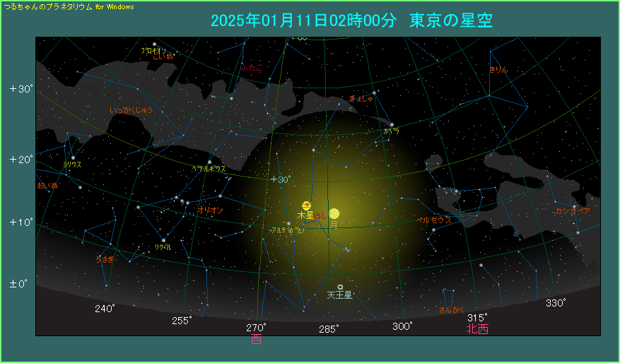 1月11日の未明、月が木星に近づいて横に並びます。
