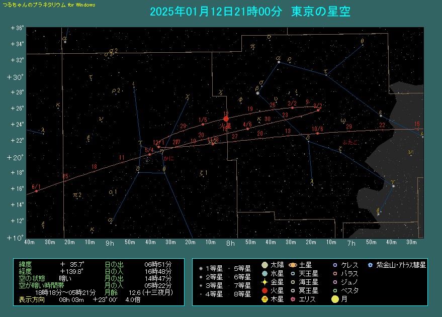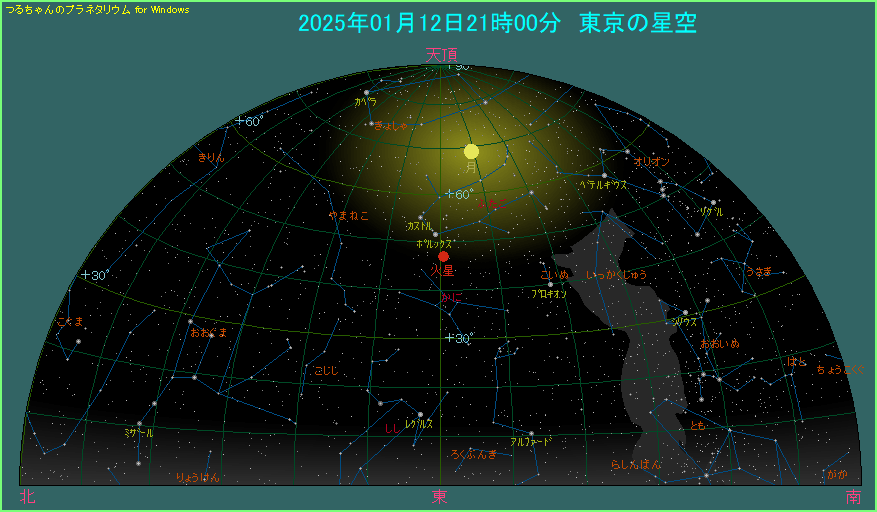 次に、21時ごろに火星が見える位置を示した星図をご覧ください。火星はふたご座とかに座の境界付近にあり、東の空の中ほどに見えます。明るく光る赤い星が見つかれば、それが火星です。明るさは-1.3等ですから、付近のどの星よりも明るく輝き、ふたご座の形を崩してしまいそうです。