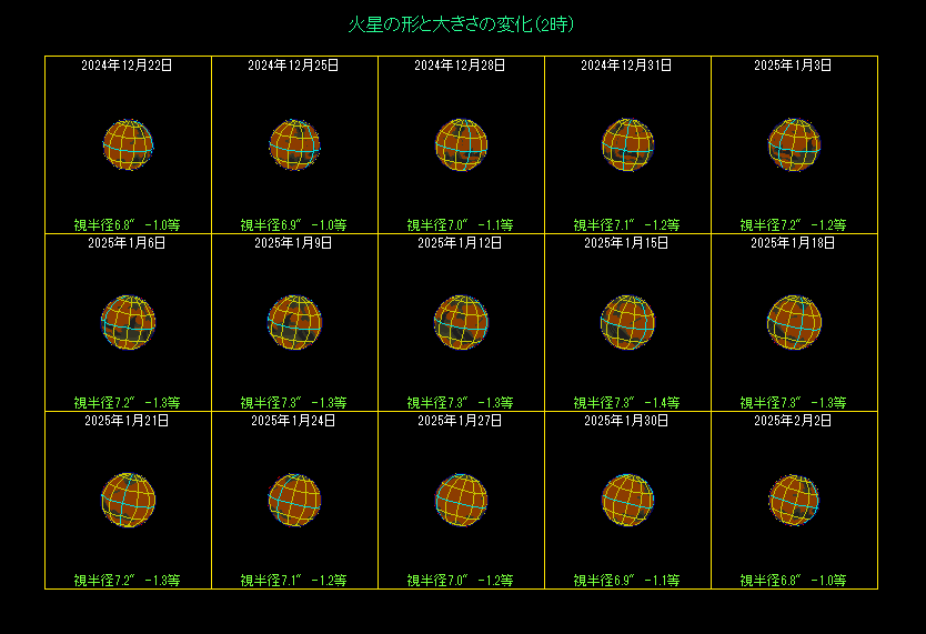 天体望遠鏡をお持ちの方は、ぜひ火星に望遠鏡を向けてください。3日間隔で2時、21時の模様の見え方を用意しました。火星の模様はよく見える側と見えない側がありますから、下の図を参考にしてください。最も濃い模様の大シュルティスは、2時なら1月5日から9日ごろ、20時なら2024年12月25日から29日が見やすくなります。この時期は火星の北半球が見やすくなっていますので、大きくなった白く輝く北極冠を観測できるでしょう。