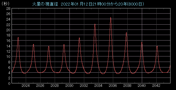 火星はおよそ2年2ヶ月ごとに地球へ近づきますが、その距離は毎回異なります。下のグラフは20年間にわたる火星の視直径の変化を表すグラフです。地球との距離が近いほど火星は大きく見えますが、グラフを見ると今回は視直径があまり大きくなりません。左から2つ目の山の高さが低いですね。このことから火星が地球にあまり近づかないことがわかります。今回を含めて今後3回の接近は、いわゆる「小接近」なのです。