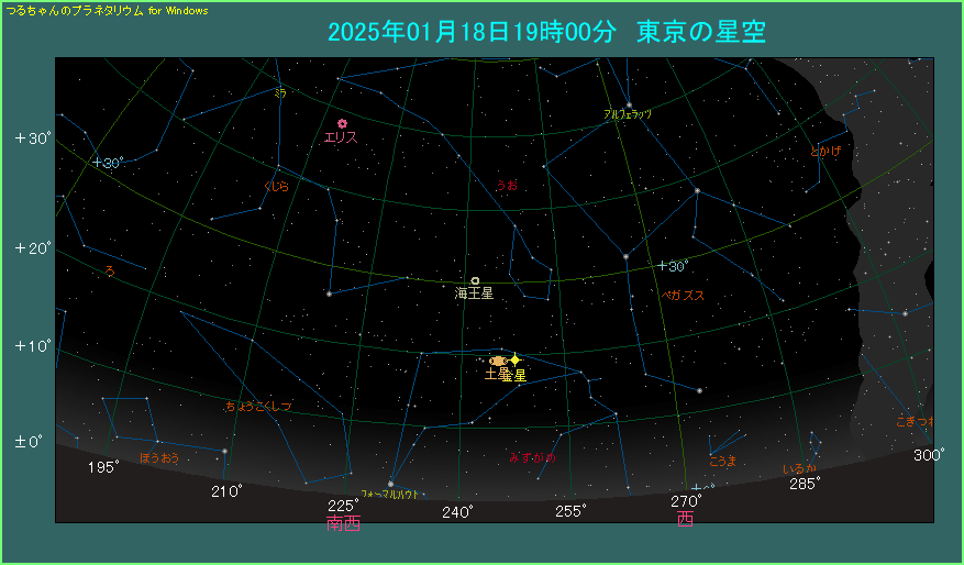 19時頃に西南西の方角をご覧ください。-4.5等と異常なくらいに明るく光る金星があります。今日はその左隣、2.2度離れて土星があります。2年前に大接近した時ほどではありませんが、今回もまずまず良い条件の接近です。