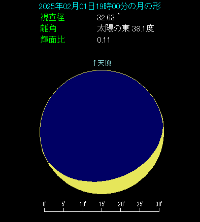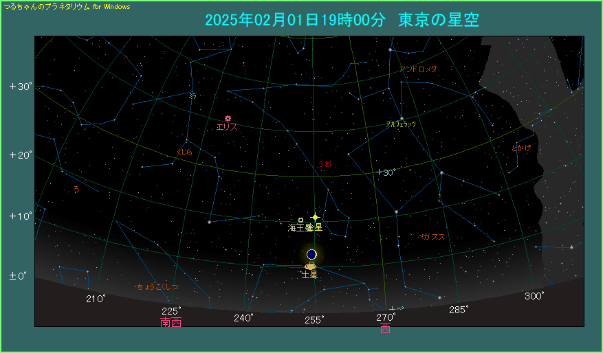 2月1日の日中、日本の一部地域で土星食が見られますが、夕方には月と土星が接近しているのが見られます。 19時ごろ、西の方角の低い位置をご覧ください。月齢2.9の三日月が見えます。月は下側が光ります。月の下側には2.7度離れて土星があります。お昼過ぎに土星食が起こったばかりですから、間隔が比較的狭くなっています。