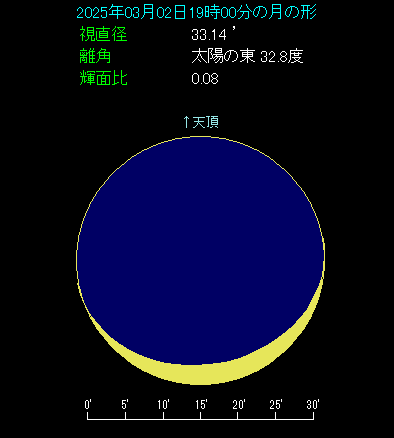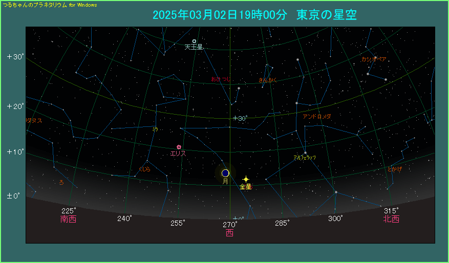 3月2日は月が金星の横にやってききます。 19時ごろに真西の方角を見ると、明るく輝く金星が目に付きます。月齢2.4の細い月は、金星の左側です。間隔は6.4度とだいぶ開いています。