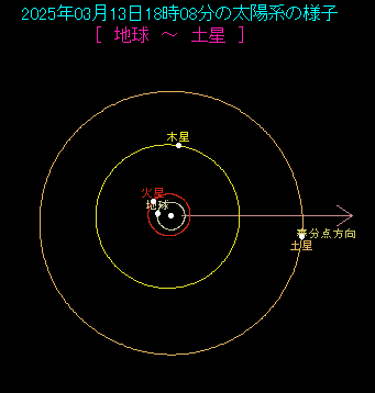 3月13日は土星が合となります。 合とは惑星が太陽と同じ方向にやってくることです。下の図を見ると、地球、太陽、土星がこの順に一直線に並んでおり、合であることがわかります。合ということで土星は太陽の近くにあり、しばらく観測することができません。