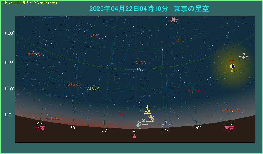 星図は日の出から50分前、東京で4時10分ごろのようすです。水星は地平線から昇ってきたところで、高度は1.5度しかありません。薄明が42分前に始まっており、しかもこの高度。いくら水星が0.4等の明るさがあると言っても、見つけるのは大変です。時間がたてば高度は上がりますが、薄明も進みます。そんなわけで、双眼鏡を使われるのをおすすめします。