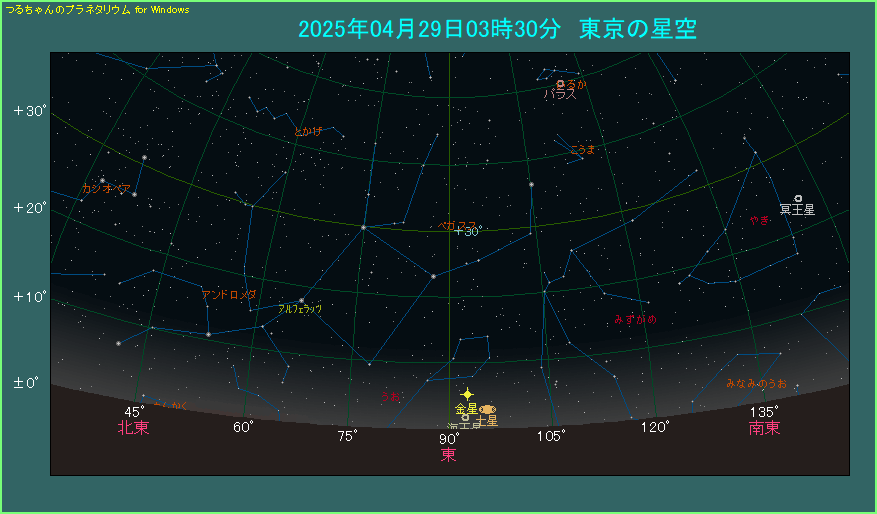 3時17分に薄明が始まってから13分たっています。今はまだ空が暗いですが、この後どんどん明るくなります。遅い時間に見られる場合は土星が見えるか不安ですので、双眼鏡を用意しておかれた方がよいでしょう。