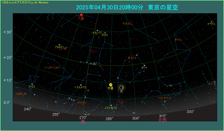 20時頃に西の方角をご覧ください。東京で18時27分に日が沈んでから、ようやく暗くなった夜空に、月齢2.7の三日月が見えます。木星は月の左隣にあり、間隔は6.6度とだいぶ開いています。この後2時台に4.5度まで近づきますが、両天体とも合わせるように21時42分に沈んでしまうので、最接近を見ることはできません。