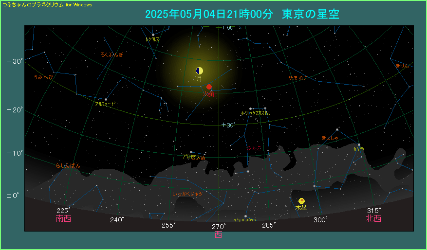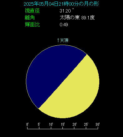 21時ごろに西の空を見上げると、空の中ほどに月齢6.7という上弦の月が見えます。輝面比は0.49ということで半分だけが光り、まさに半月です。