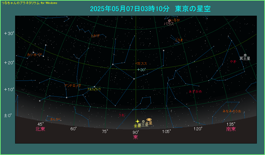 上の星図は東京から3時10分に東の低空を眺めた様子です。明るく光る金星があり、5.8度右側に土星があります。明るさは1.2等ですから、肉眼でも十分見えます。天体望遠鏡を使うと環がないという、珍しい土星の姿を見ることができます。