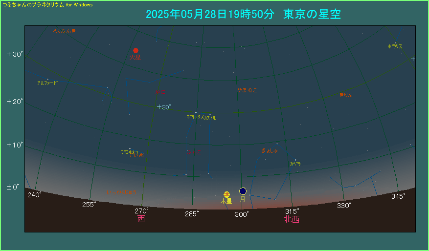東京で日没から1時間ほどたった19時50分、西北西の低空をご覧ください。空が完全に暗くなるのは44分後ですので、まだ薄明中です。高度4.6度という低い位置に木星が光るのがわかるでしょうか。