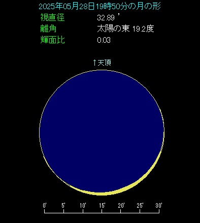 木星の右側からやや上方へ5.4度離れたところに、月齢1.3という糸のように細い月があります。月の光は大変弱々しいですし、高度5.6度という低空も手伝って、肉眼で見つけるのは難しいでしょう。でも双眼鏡を使えば、なんとか見つけられるかもしれません。