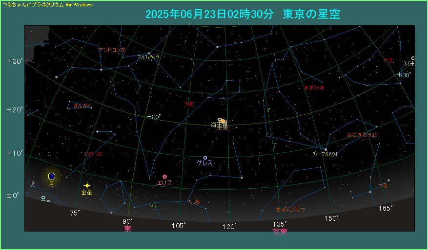 2時30分ごろの土星は南東の空に見えます。明るさは1.0等で、環が非常に細くなっています。天体望遠鏡で見ると土星本体に、環が直線状に突き刺さったように見えるかもしれません。天体望遠鏡を使って、珍しい土星の姿もご覧になってください。