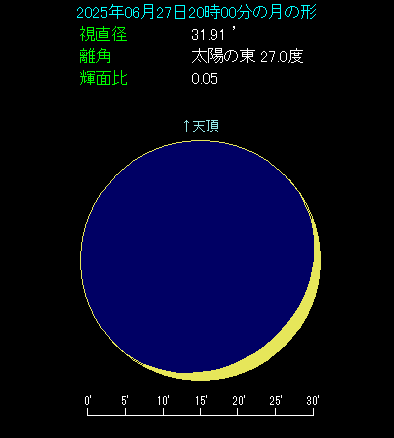 20時ごろに東京から西北西の低空をご覧ください。高度8.9度のところに、月齢2.0という非常に細い月があります。輝面比0.05というこで、直径の20分の1しか光りません。ですから、その光は弱々しいものです。通常の三日月を見つけるつもりで空を眺めても、サッパリ見つかりません。空が暗くなったほど良いタイミングに見るか、もしくは双眼鏡を使いましょう。