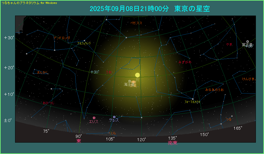 2025年9月8日は月と土星が斜めに並びます。 21時ごろに東南東の方角を見ると、空の中ほどに満月があります。一方の土星は月の左下です。0.6等の明るさがありますので、まぶしい満月の近くでも肉眼で見ることができます。
