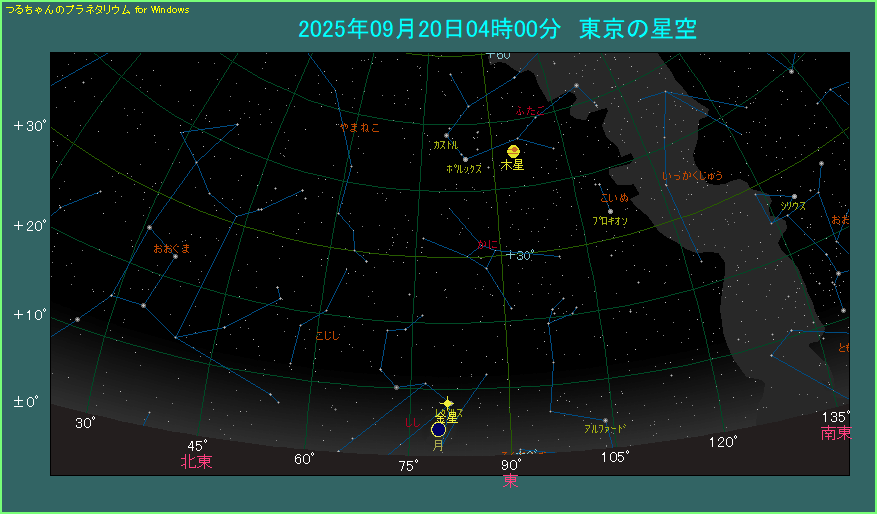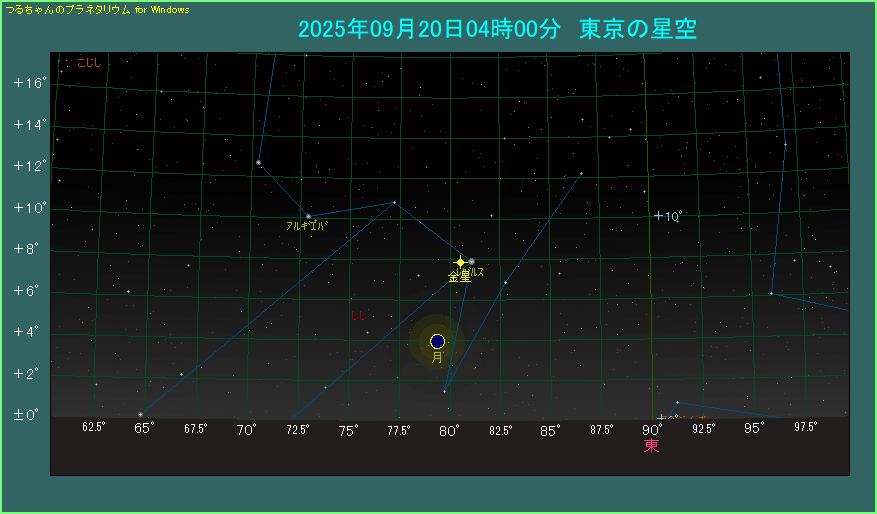 偶然ですが今日はこの二天体に月が近づいて、斜めに並びます。月は地平線近くにあり、月齢は27.5です。2日後が新月ということで非常に細くて光が弱いため、肉眼だと見づらいかもしれません。月と金星は4.1度、レグルスとは4.3度の間隔です。