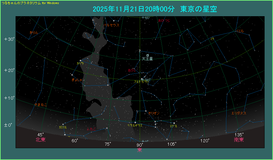 場所はおうし座のプレアデス星団からそう遠くない所です。幸い前日が新月ということで、この日は月明かりがありません。20時ごろに東の方角を見上げ、星図を頼りに探して見られてはいかがでしょうか。