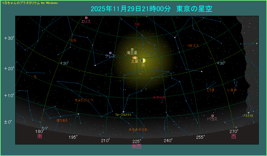 今月は2日に続いて29日も、月と土星が並びます。 21時ごろに南西の方角を向いて空の中ほどを見ると、半月過ぎの丸みを帯びた月が見えます。月の左側に土星があり、0.8等の明るさです。