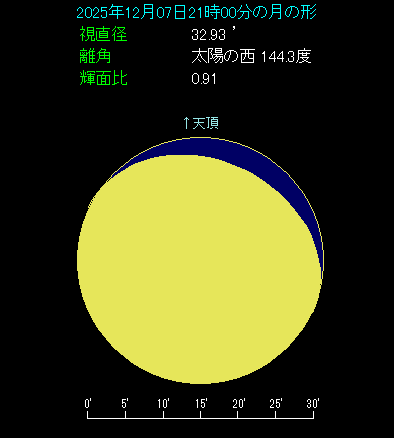 21時ごろに東の方角を見ると、月齢17.2という、満月から2日が過ぎた月があります。月の右下に4.0度離れたところで金色に光る木星があり、斜めに並んでいます。