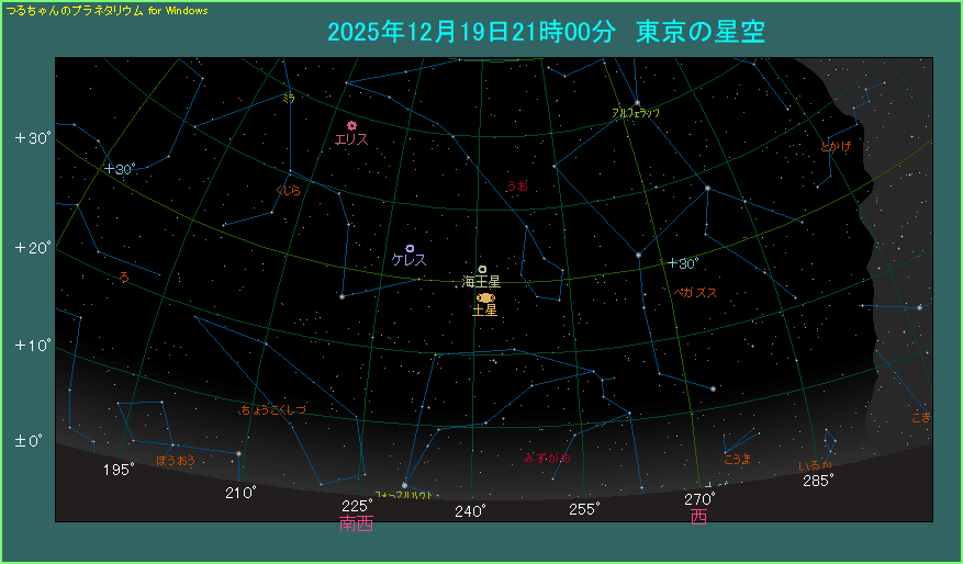 21時ごろ、土星は南西の空に見えます。明るさはちょうど1等ですから、市街地からでも肉眼で簡単に見つけることができます。落ち着いた黄土色に光る星を見つけたら、土星に間違いありません。