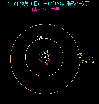 東矩とは惑星が太陽の東側へ90度離れることです。太陽系の図を見ると、太陽・地球・土星の順に結んでできた直線のなす角度が90度になっています。衝を過ぎてから太陽との離角が小さくなっており、この後はさらに離角が小さくなります。来年3月26日の合に向けて、次第に観測条件が悪くなっていきます。