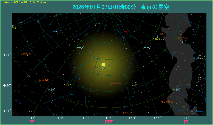 下の星図は日付が変わって間もなく、1月7日1時ごろのようすです。多くの地点で間もなくレグルスが月に潜入します。潜入は月の明部で起こり、東京では1時17分ごろです。月齢17.6と満月から4日後の大きな月ですから、見づらいかもしれません。