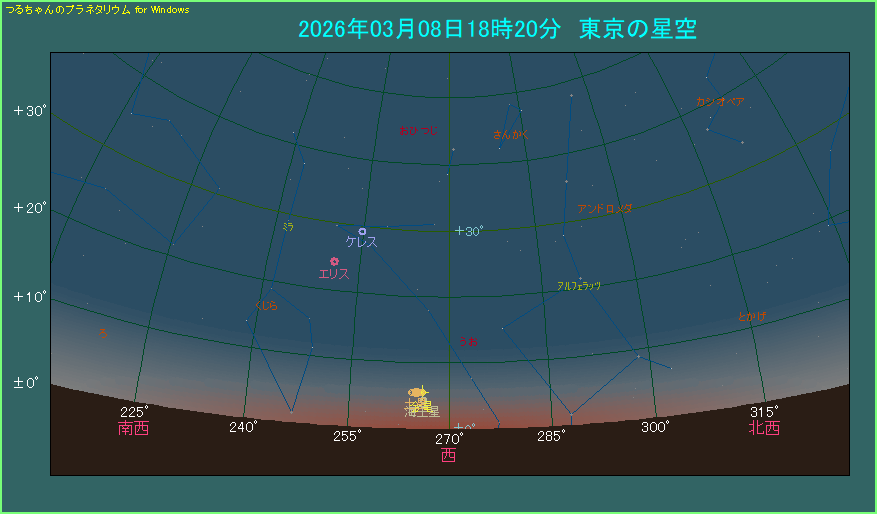 東京で18時20分ごろに西の方角、低い位置をご覧ください。日の入りから40分もたっていない薄明の中、5.5度という低空に金星があります。金星が明るいとはいえ、空の条件次第で肉眼で見るのは怪しいかもしれません。