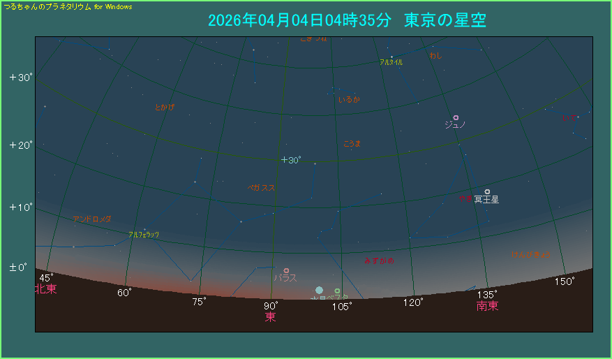 3時57分から薄明が始まっていますし、地球大気による光の吸収も大きいですから、0.3等の水星も肉眼で見るのは難しいかもしれません。もう少し時間が経って水星の高度が上がるのを待ちたいところです。しかし待ちすぎると日の出を控えていますので、空が明るくなって条件が悪化します。ほど良いタイミングでご覧ください。
