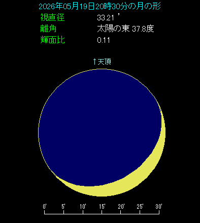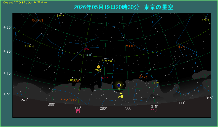 ちょうど空が完全に暗くなった20時30分ごろ、西北西の低い位置をご覧ください。非常に明るい金星と、月齢2.6の三日月が見えます。間隔は5.2度と狭いわけではありませんが、縦に並んでいるのが印象的です。月が細くて地球照が美しく、さらに印象に残ります。