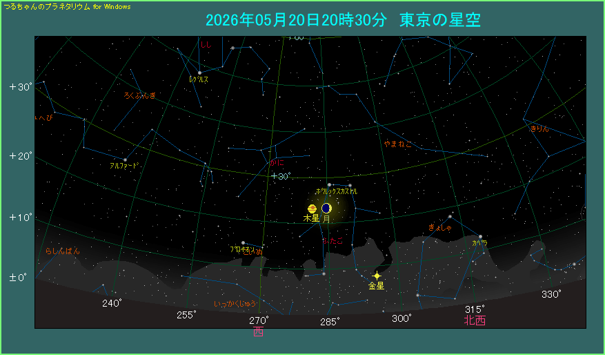 昨年から毎月のように近づいている、ふたご座のポルックスとカストルも近い位置にあります。月との間隔はそれぞれ、5.1度と7.2度です。この4天体の接近も、そろそろ終わりが近づきました。暗夜で見られるのは今月限りですから、ぜひご覧になっておいてください。来月は金星と水星も加わって、これを最後に見納めとなります。