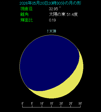 20時30分ごろに西の方角を見ると、月齢3.6の三日月が目に飛び込んできます。今日は月の左側に金色に光る木星があり、横に並んだ格好です。間隔は3.1度と、比較的狭い目です。月の右下には、昨日近づいた金星も光っています。