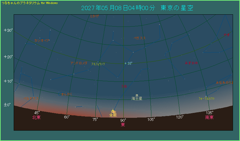 星図の4時という時間は、薄明が始まってから55分が経過しています。日の出の4時43分が近づいており、空はかなり明るくなっています。土星は見えないかもしれませんので、双眼鏡を用意しておかれた方がよいでしょう。