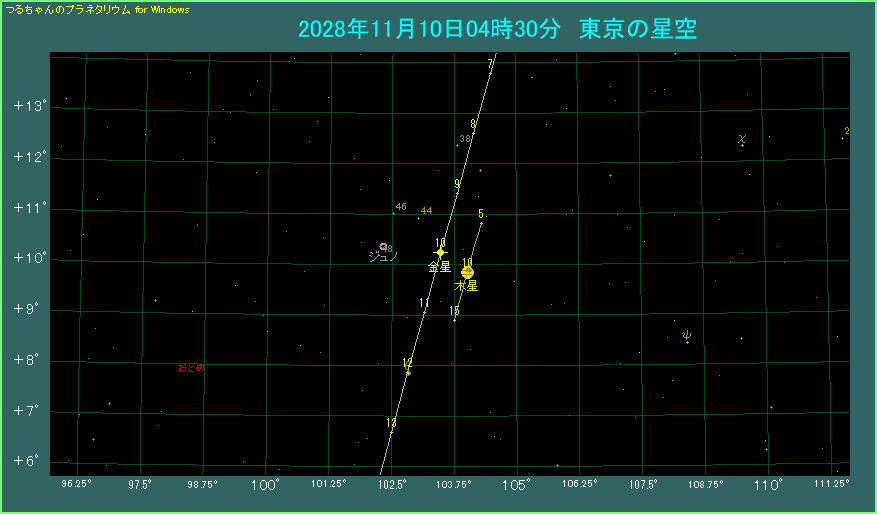 11月8日から11月13日の期間は間隔が3度を切ります。通常なら条件の良い接近ですから、最接近となる10日に見られなくても、あきらめないでご覧ください。星座に対する金星と木星の経路も示しておきました。位置関係を知るための参考にしてください。