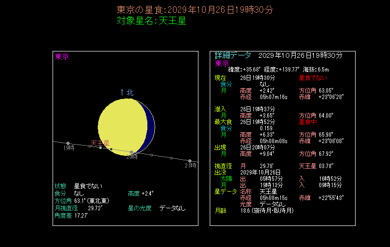 東京では19時30分頃に天王星が月に隠されます。といっても月の光が強烈な上に天王星は6等級です。光度差がありすぎて観測するのは容易ではありません。また、月の高度が2.4度しかありませんので、実質的に観測するのは難しいでしょう。月の出が遅い西の地域では地平線下ですから、月の姿を見ることすらできません。