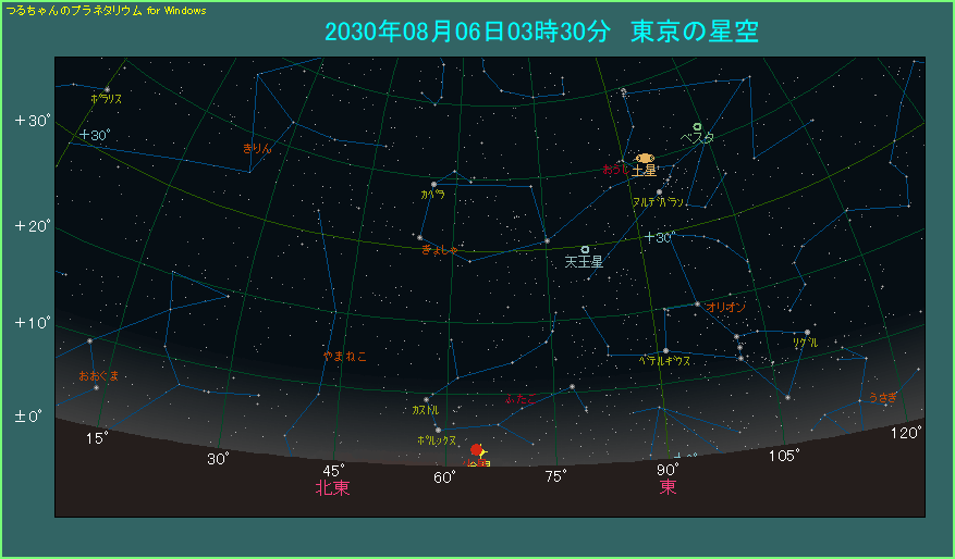 東京では3時15分から薄明が始まっています。この後、空がどんどん明るくなりますので、早いうちにご覧ください。特に火星は1.7等ですので、早い段階で見えなくなってしまいます。