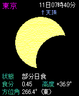 東京の場合で6時42分(高度25度)に欠け始め、最大が7時41分(高度37度)、終了が8時45分(高度50度)です。東京の場合の進行状況を下に示しておきます。