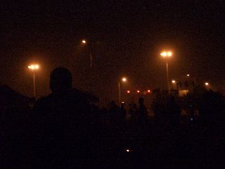 皆既日食になる5分前頃から雨がやんだ。しかし、晴れ間がのぞく気配は全くなし。シャドーバンドも本影錐も、ダイヤモンドリングもきっと厚い雲の中だろう。そんな中で周囲の光がどんどんと失われていく。5秒単位で空が暗くなっていく。次の瞬間、空が本当に暗くなった。皆既日食だ! 通常なら夕暮れ程度にまで空が暗くなると言われるが、今日は雲が厚いので本当に真っ暗。隣の人の顔を判別するのも難しい。周辺に設置されたネオン灯だけが異常に明るく感じられた。