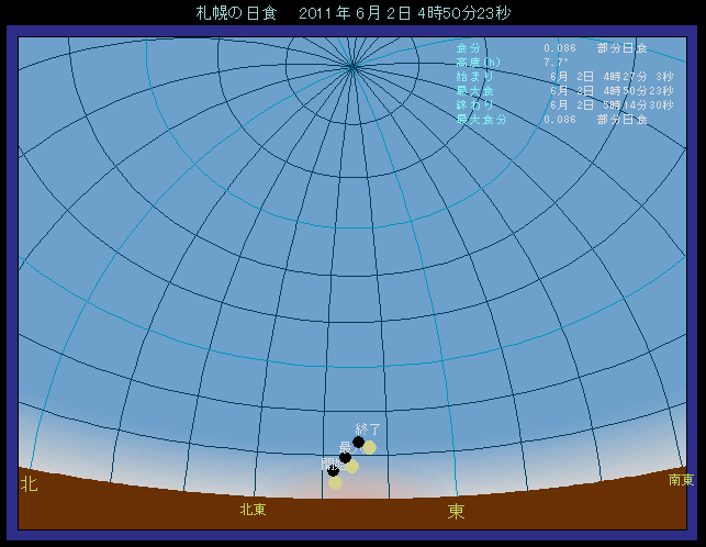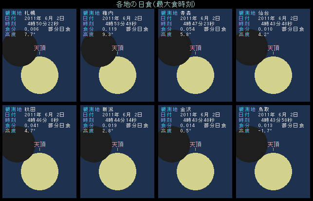 2011年6月2日の部分日食は日の出直後に見られます。日食状態は数分から数十分しか続かず、ごくわずかしか欠けません。最も条件が良いのは北海道ですが、条件が最良となる稚内でも12%ほどしか欠けません。南へ行くほど欠け方が小さくなり、札幌で9%、青森5%、新潟2%、仙台1%などとなっています。日食が見られる地点について、2010年6月2日の日食データを載せておきましたので参考にしてください。