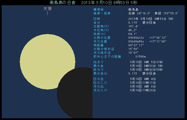 昨年の11月にオーストラリアで皆既日食が起こりましたが、その半年後となる2013年5月10日に、今度は金環日食が見られます。金環帯はオーストラリアの北西部から北部を通っており、昨年皆既日食の舞台となったケアンズなどは、金環帯から外れています。NASAの予報によると、金環継続時間の最大は太平洋上の北緯2度、東経175度付近で、金環継続時間は6分3秒、食分は0.954となっています。詳しくはページ下部にある日食ナビへのリンクをご覧ください。また日本では、下図のように南鳥島など南洋諸島では部分日食となります。