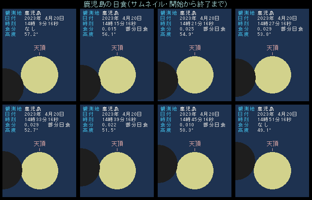 このため各地とも、日食の継続時間が短くなっています。例えば鹿児島では、14時9分に開始してから14時29分に終了するまで、わずか20分しかありません。